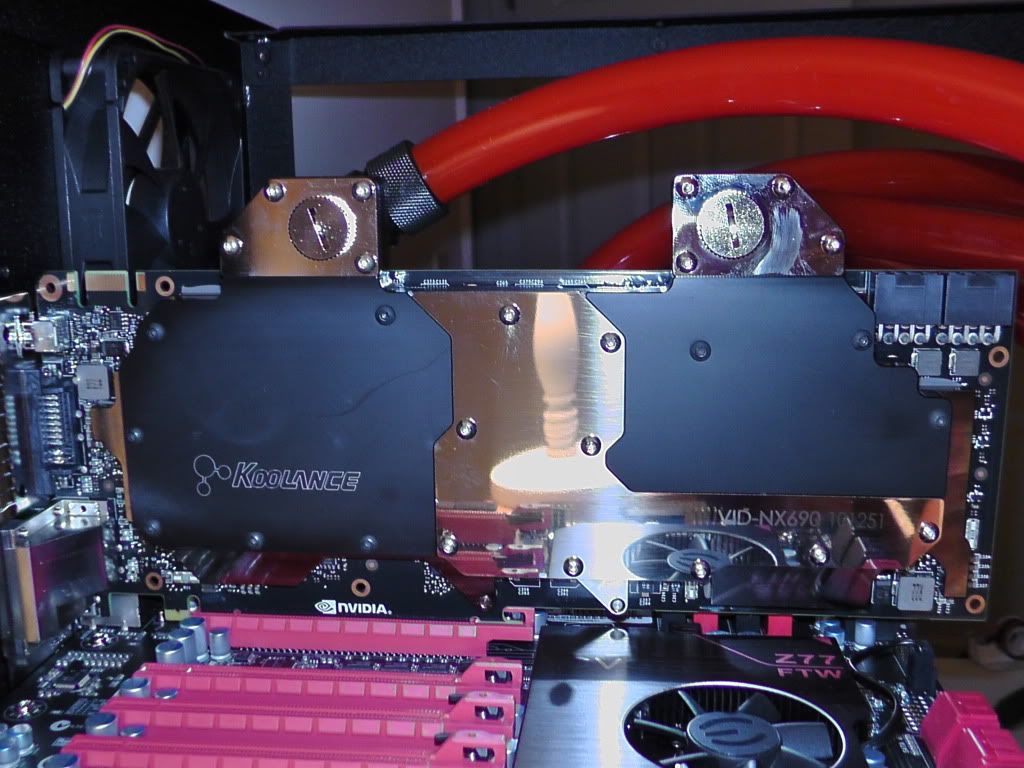 Update: I am no longer using the GTX 690. I purchased 2x EKWB MSI 7970 Lightning water blocks and 1x EKWB Bridge.