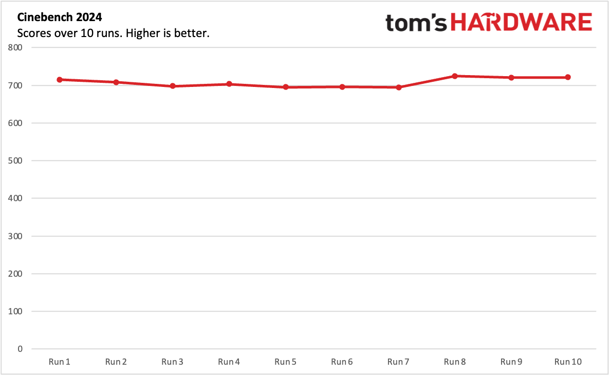 We stress test laptops by running Cinebench 2024 for ten runs. The Swift started at 714.57 before dipping down into the 690's. By the end, the system had recovered and was running as high as 724.37 before starting to show a dip by the end of the runs. According to HWInfo, (which now supports Snapdragon's Oryon processors in beta), the CPU ran at an average of 3.4 GHz and measured 68.62 degrees Celsius.
