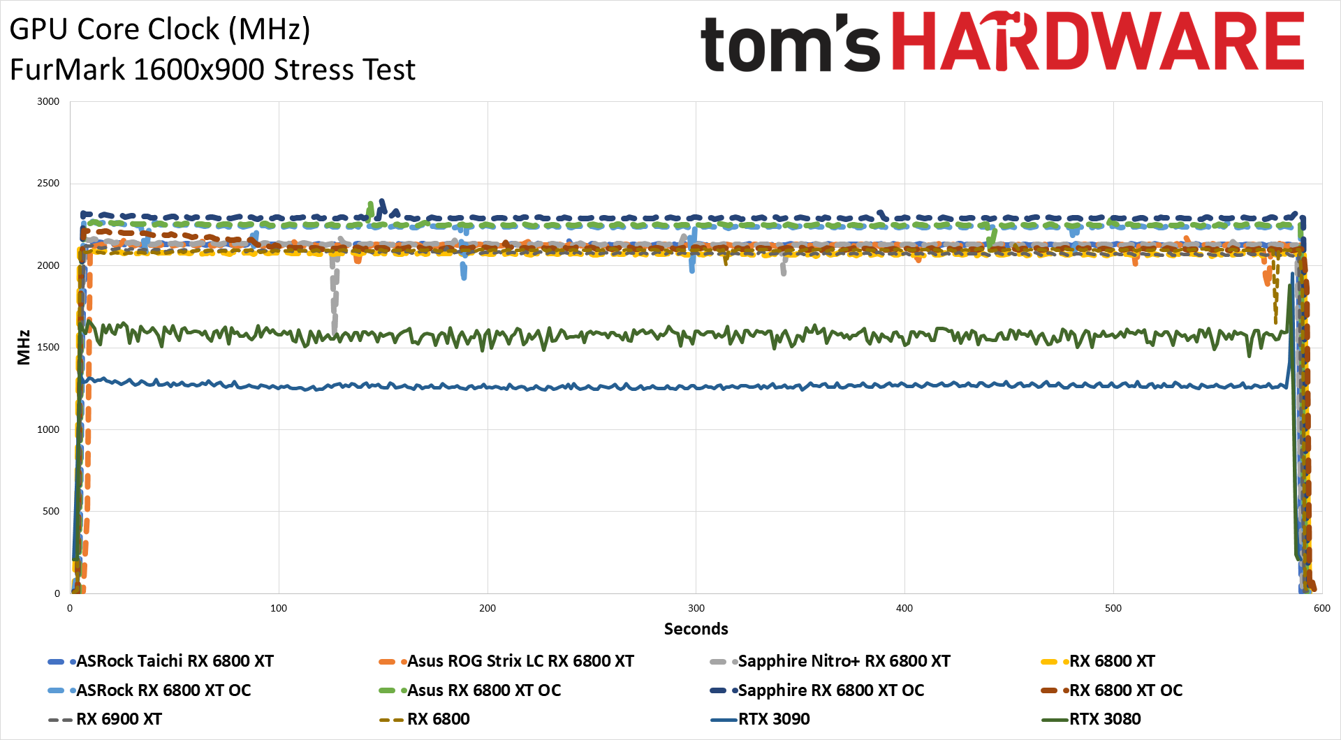 At factory stock settings, all of the RX 6800 XT cards meet or exceed the official boost clock, though in-game clocks will vary by game. In Metro, the custom cards reach 2386-2394 MHz average clocks, with overclocking pushing all three cards into the 2500 MHz and higher range. FurMark is a different story, with the GPUs reigning in clocks in order to keep thermals and power use in check, but 2.1GHz while running FurMark is still quite impressive, and overclocking takes that up to around 2.25GHz.