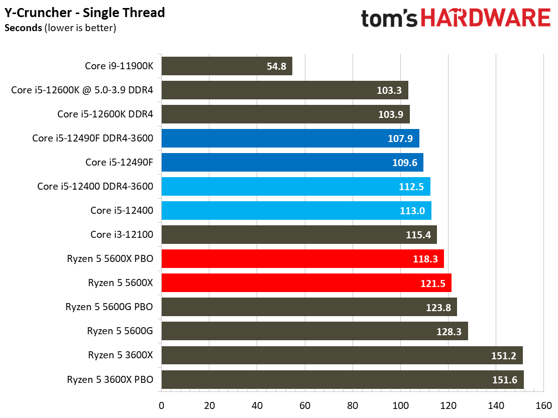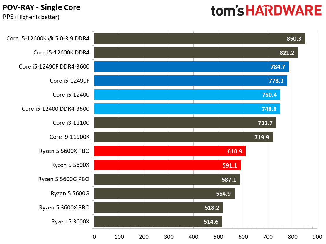 The Core i5-12490F is impressive in single-threaded rendering work, leading all competing Ryzen chips in Cinebench and POV-Ray benchmarks, not to mention the Core i5-12400.