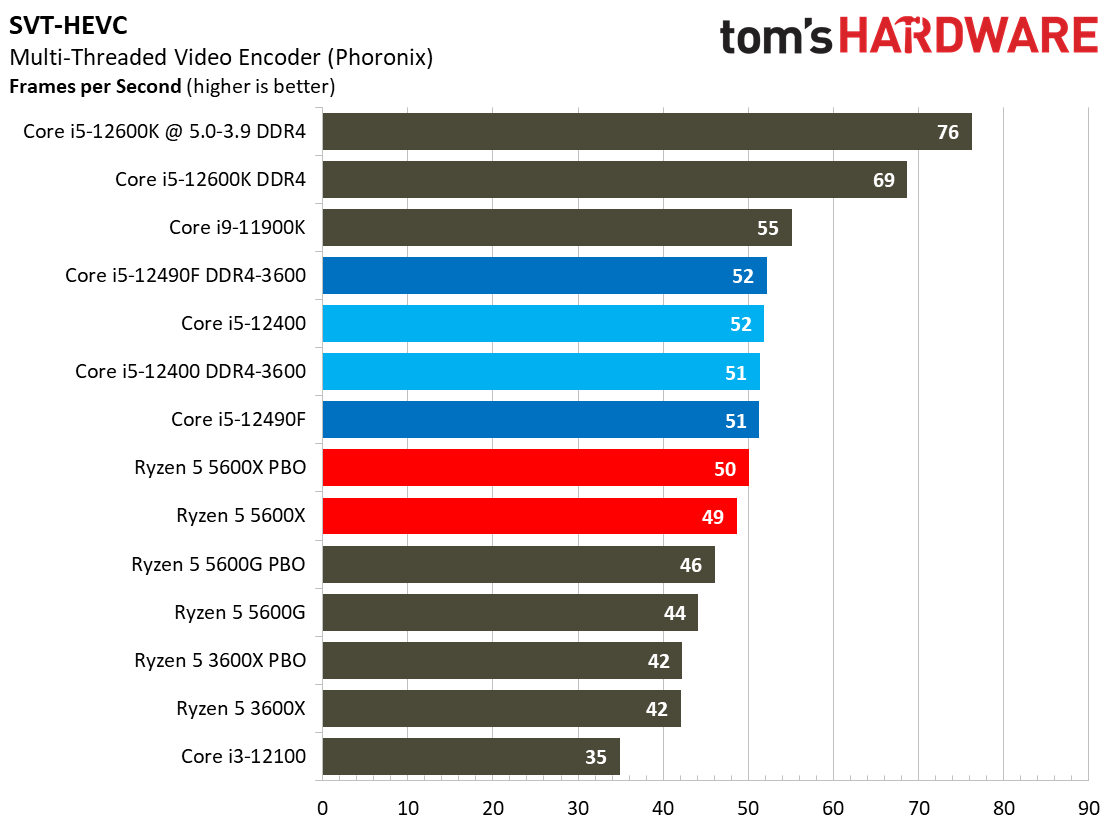 While the Core i5-12490F carves out some leads over the Core i5-12400 in various workloads, it doesn't improve Core i5's competitive positioning against the Ryzen 5 comparables. In fact, the Core i5-12490F's biggest problem is its little brother — the Core i5-12400. Despite AMD's recent price cuts, the Core i5-12400 remains the mainstream chip to beat.