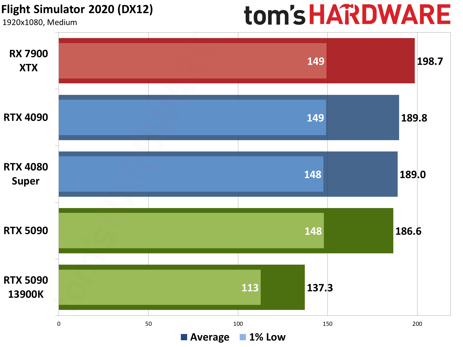 What's interesting here is just how massive the gap is between the 13900K and the 9800X3D. Even at 4K ultra, the AMD CPU delivers 48% more performance than Intel's (slightly older) 13900K. But the 14900K would only narrow the gap by about 5%, and the Core Ultra 9 285K often performs worse than the 14900K. Flight Simulator 2020 is known to love AMD's X3D chips, though the new version isn't nearly so cache friendly.