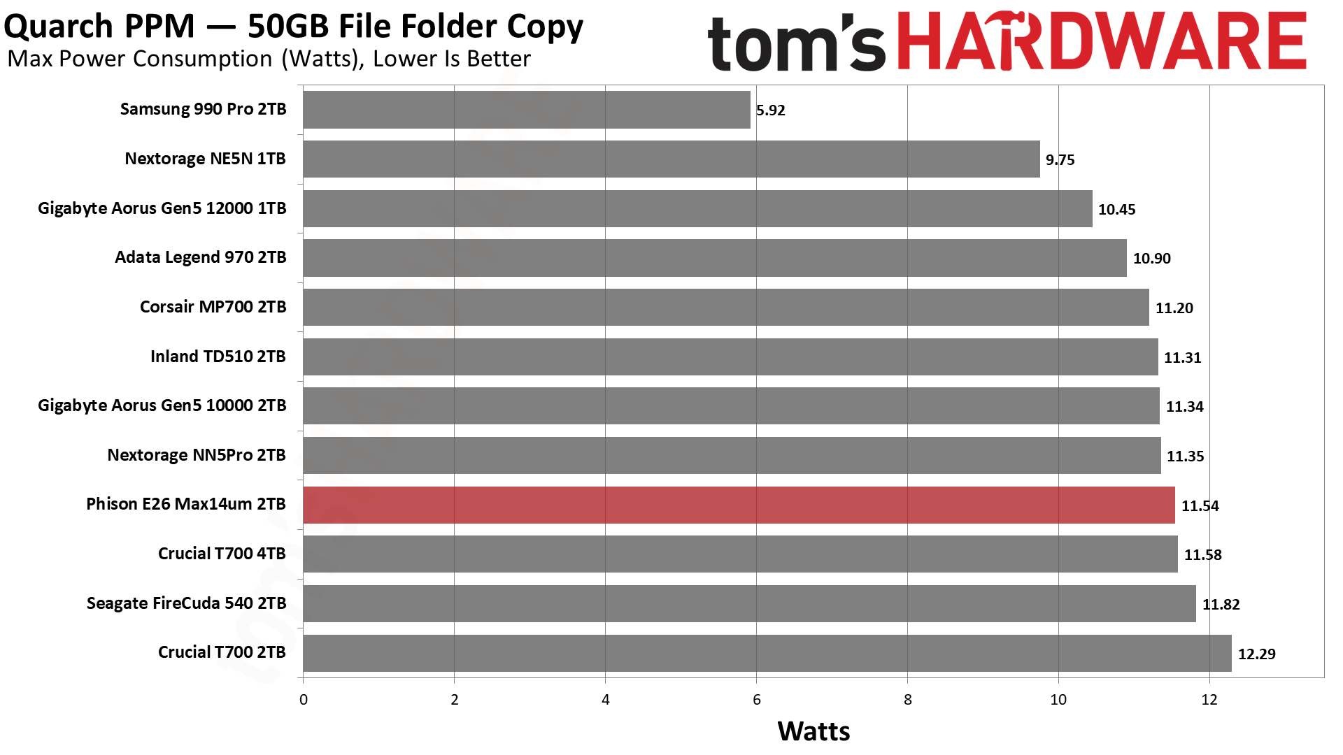 The Max14um is simply the fastest SSD we’ve ever tested, and we gave Phison one of our Best of CES awards for moving the entire consumer storage industry forward. It’s not perfect, though: Our original complaints about power consumption and thermal output remain valid. It’s expected that a high-end PCIe 5.0 SSD will pull a lot of power, but idle desktop consumption remains high. Efficiency also leaves something to be desired, but we expect this will be cleared up in time with more efficient controllers and flash.