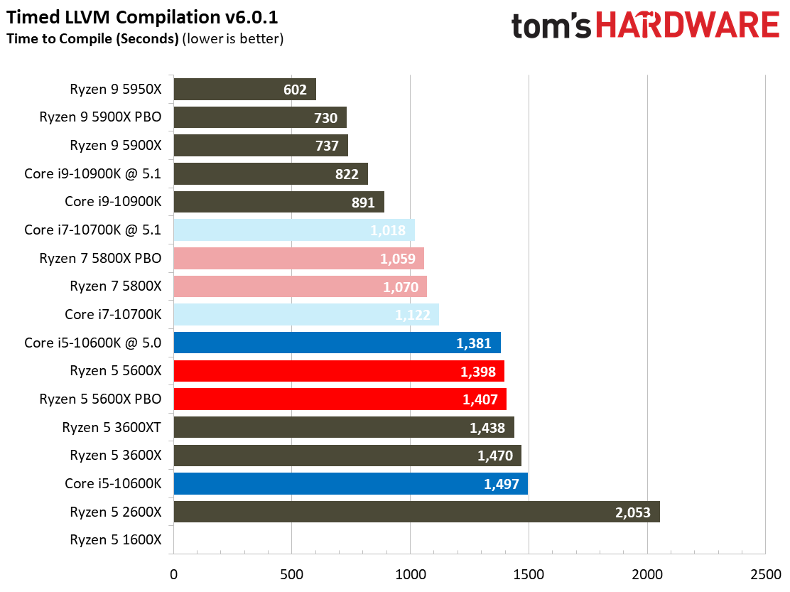 The LLVM compilation benchmark stresses the cores heavily with branchy code. Here we see that, like with the Ryzen 9 5950X and 3950X, the Ryzen 5 5600X doesn't offer much performance uplift over the previous-gen Ryzen 9 3900XT. These muted gains imply that the bottleneck lies elsewhere, and we imagine that future software optimizations could yield larger performance deltas.