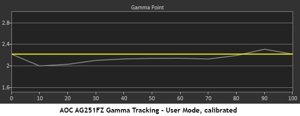 The AG251FZ is last. Tracking is simply not as tight as the other screens. The difference is small but can be seen in a side-by-side comparison. The average value test has a better result as the AOC manages to keep its luminance values around the 2.2 mark.