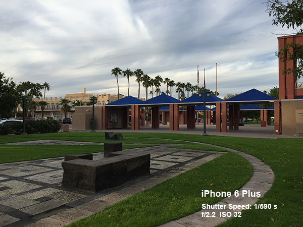 In our first set of images, taken on a partially overcast day, we see some minor differences between the test images. The 5s uses the fastest shutter speed, resulting in the darkest image overall, with the iPhone 6 and 6s devices using progressively longer exposures, increasing brightness a bit. The 6s phones also have a slightly lower minimum ISO of 25 versus 32 for the previous model. The LG G4 and Samsung Galaxy S6 use the longest exposures, resulting in the brightest images.