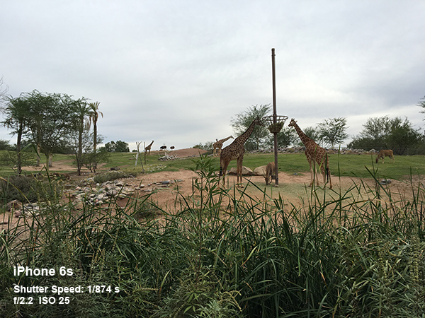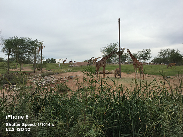While hunting big game in Africa, we stumbled upon these giraffes. It was late in the afternoon, on an overcast day, and with no large predators in sight, we decided to take advantage of this challenging lighting condition to test smartphone cameras. The LG G4 produces the worst looking image of the group by far, partly because the image is too dark and partly because the G4's camera consistently focuses on the plants in front, leaving everything behind, including the giraffes, blurry. The Galaxy S6 produces a nicely detailed image once again that's a bit darker than the iPhone images but with richer colors. Image noise is minimal and similar to the iPhone 6s, including some light halos around objects from the noise reduction processing.