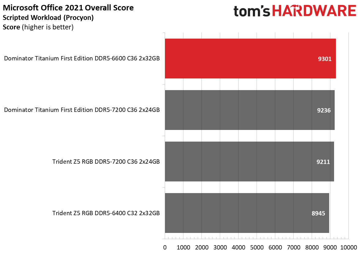 Predictably, the Dominator Titanium memory kit fell behind the DDR5-7200 memory kits regarding cumulative application performance. It excelled in the Adobe Premiere, where the added capacity gave it an edge over the 32GB (2x16GB) memory kits. The Dominator Titanium was up to 3.7% faster than the DDR5-7200 memory kits.