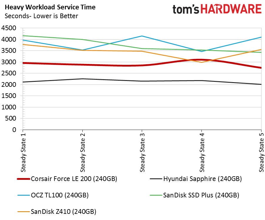 Compared to regular SSDs, all the drives exhibit poor service time metrics in the recovery stages. The SanDisk Extreme Pro, one of the fastest consumer SATA SSDs, scores around 100 seconds during the recovery phases. That is a 5x performance increase compared to the Hyundai Sapphire, and a 10x increase compared to the Force LE200.