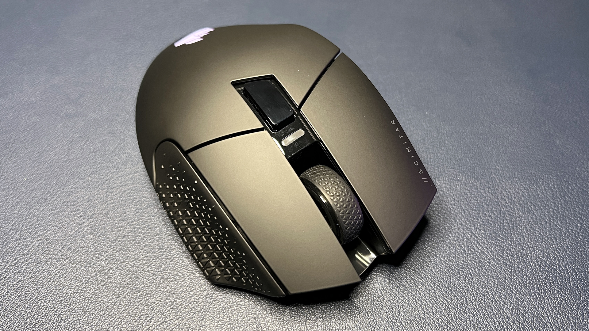 The Scimitar Elite Wireless is housed in a black plastic chassis with a soft-touch matte finish that’s pretty prone to picking up oil from your skin (it has the same finish, with the same issues, as the Corsair Katar Elite Wireless). It’s a wide mouse, designed to be used with a palm grip, and it has an extra groove along the right side for resting your ring finger. This groove features some texturing that extends down the side of the mouse, which is fine in terms of comfort but probably isn’t super necessary — most people aren’t using the ring finger or pinky to grip their mouse, and it’s unlikely you’ll be picking this mouse up at all.