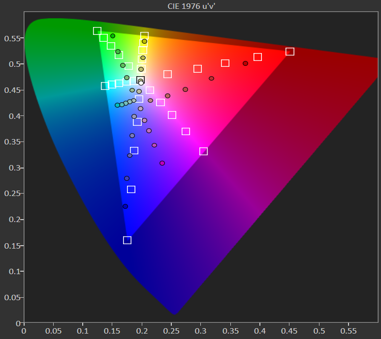 The RGB imbalance is also a major issue. At virtually every brightness level the display’s blue levels are dramatically high, while the red and green levels plummet. This results in a harsh, blue tint, and unfortunately the RGB levels do not recover at maximum brightness. You don’t need the DeltaE 2000 chart to show you how inaccurate the display is; the color errors are quite literally shoved in your face.