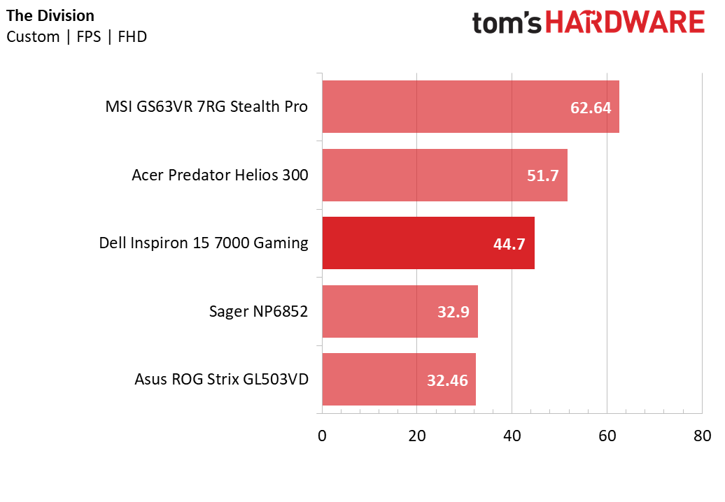 The Division isn’t as demanding as Rise of the Tomb Raider, but it still presents the Inspiron a challenge. The reduced power draw imposes a 7 FPS reduction on the Inspiron’s performance, pushing it just below 45 FPS. The Inspiron fares better than the Sager and Asus, which barely maintain 30 FPS. You’ll need at least a Max-Q GTX 1070 to achieve 60 FPS here.
