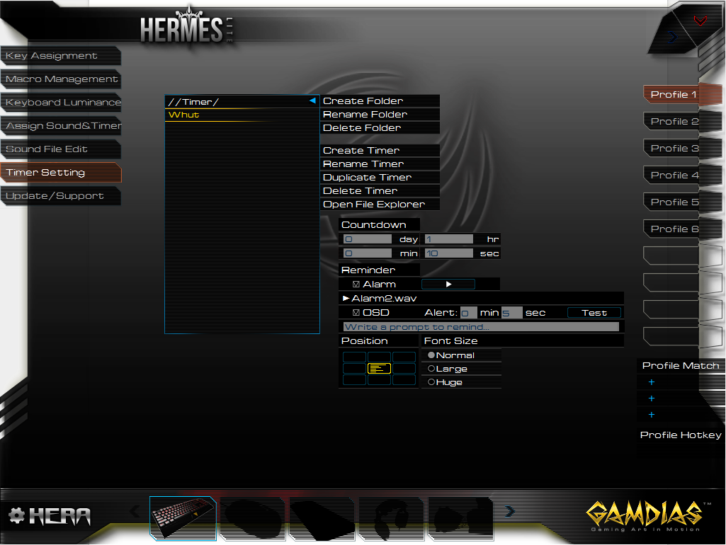 This is a somewhat quirky feature, but some users will no doubt get a kick out of it. You can assign sounds (either software presets or some of your own creation) to certain profiles so that you know which profile you're using, or to a given macro so that you know for sure when one has been activated. The timer function simply allows you to delay a macro's execution for a certain amount of time.