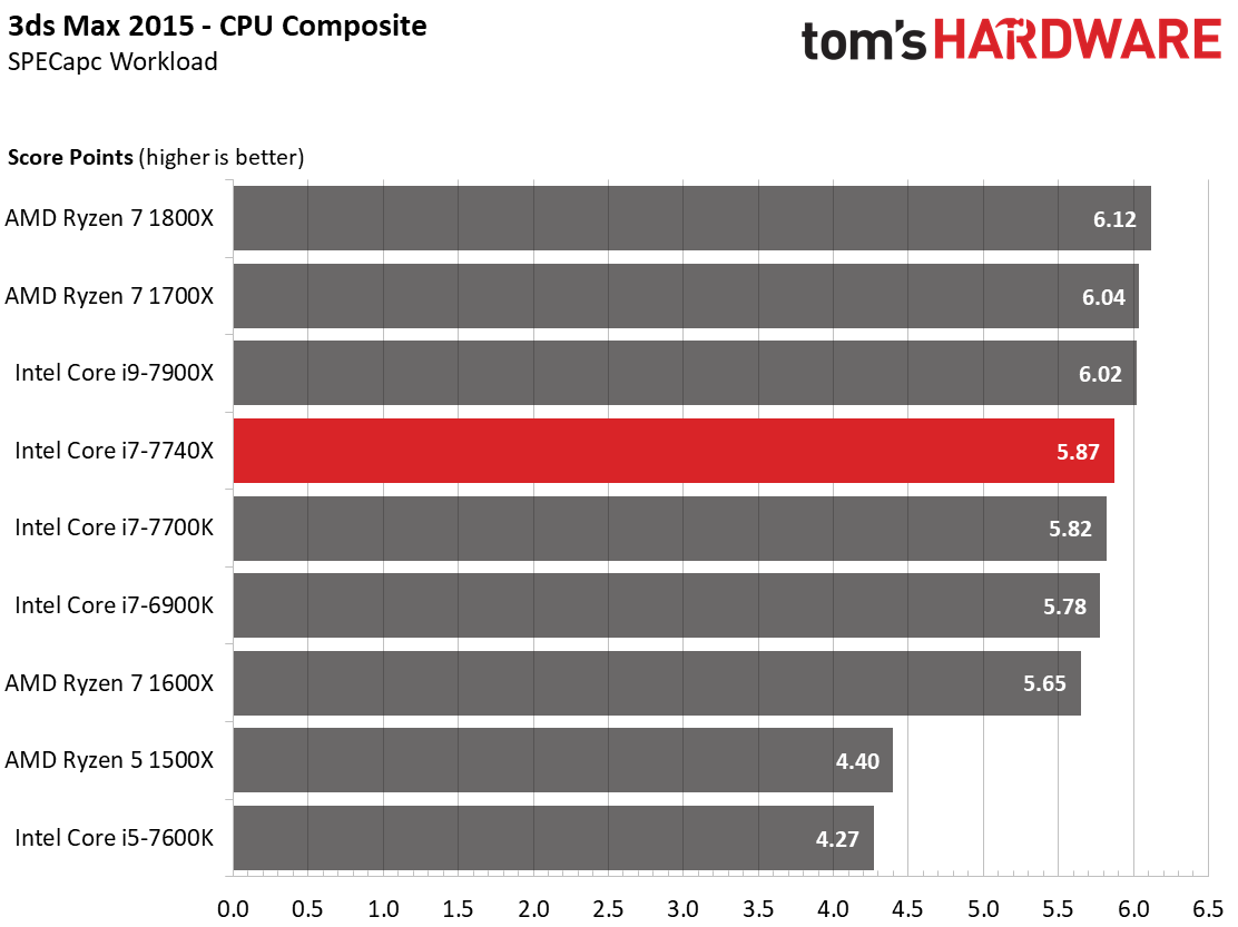This final benchmark discipline spells doom for Intel’s Core i7-7740X. Its designation as a high-end desktop part suggests it should do well, but that's just not the case. With four Hyper-Threaded cores, the -7740X carves out a spot in the back of the field.