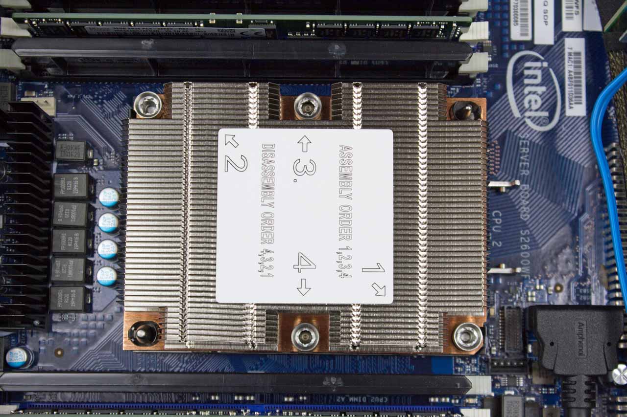 The Platinum 8176 processor is a big step forward. Here, we see it flanked by Intel's desktop Core i7 and HEDT Core i9 CPUs. Although we're no longer dealing with the socket latching mechanism Intel previously employed, these chips still use a Land Grid Array (LGA) interface. Interestingly, you first snap the processor into the heat sink, where two plastic clamps hold it tight. A pair of guide pins on the socket ensure correct sink and processor placement. Then, once installed, you secure the heat sink with four Torx screws. The processors drop into Socket P, otherwise known as LGA 3647, on platforms with Intel's C610 Lewisburg family of platform controller hubs.