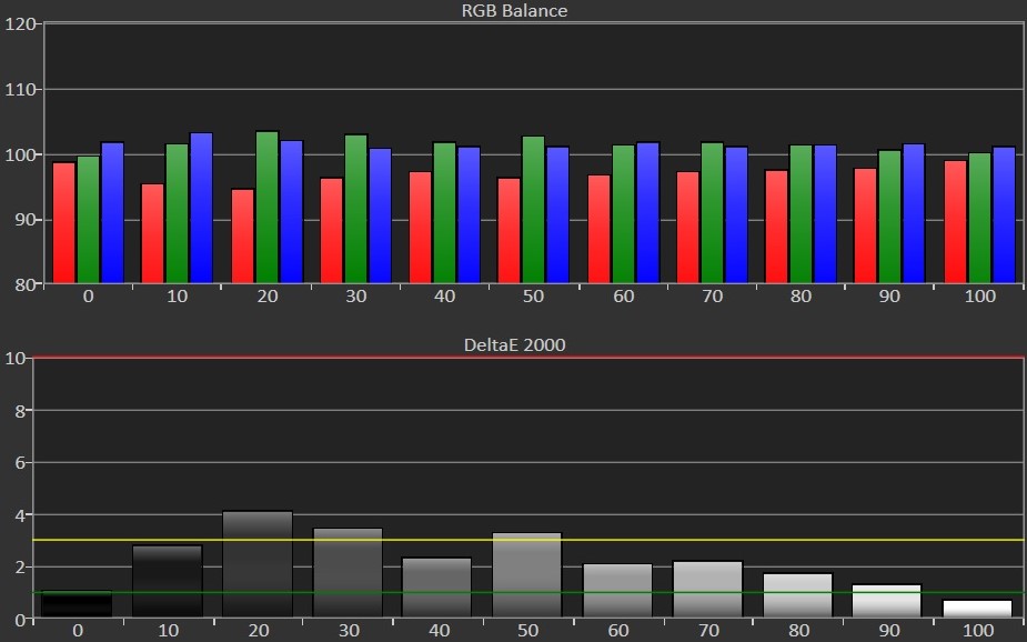 Continuing this trend, the Raider’s display offers great RGB balance. The blue levels remain slightly higher than optimal at all brightness levels. Meanwhile, red levels take a slight dip and green levels jump upward. Luckily, reds and greens balance out at maximum brightness.