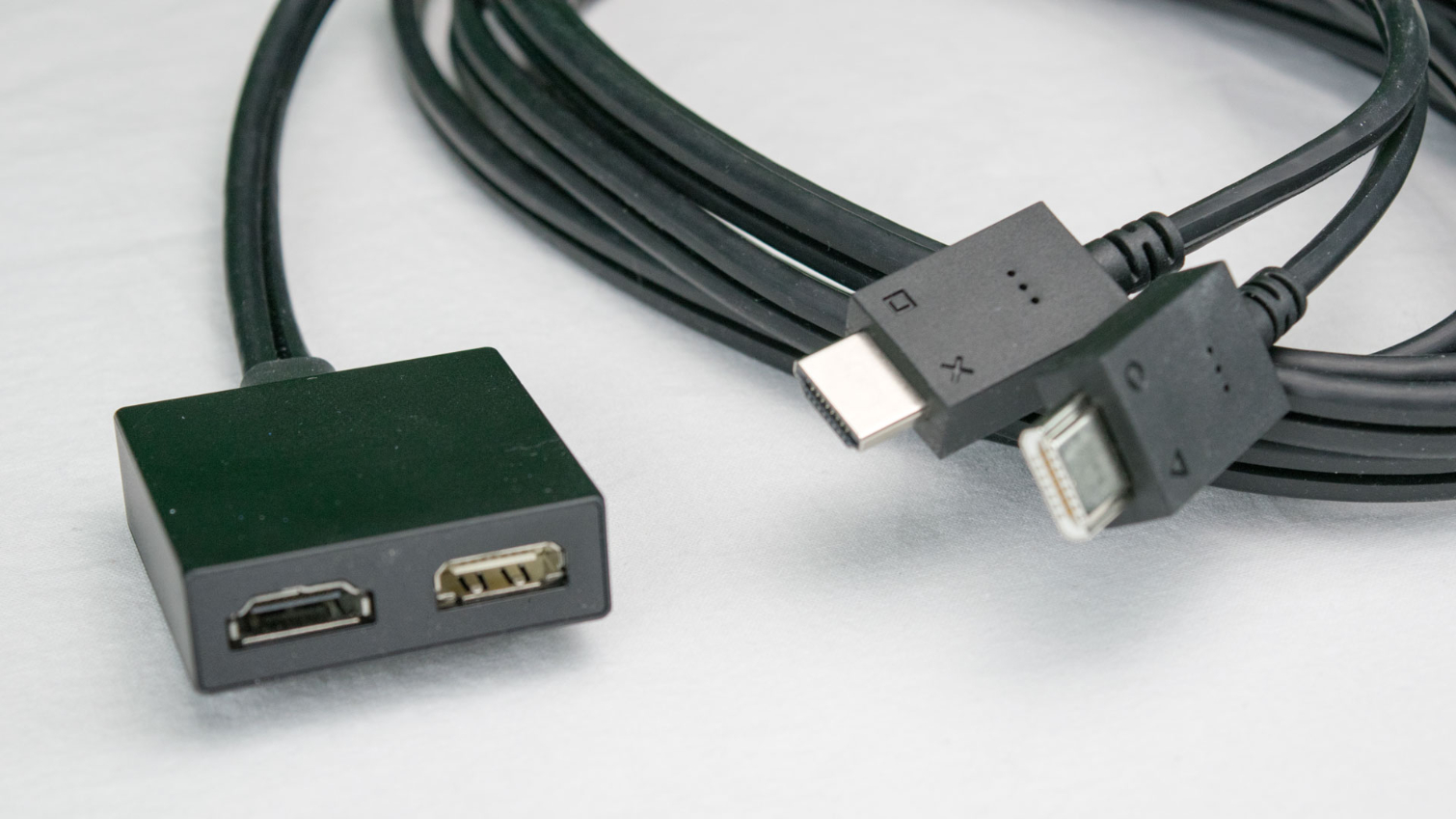 The end of the PSVR’s data cable splits into two plugs: an HDMI connector and a proprietary interface that carries data from the PlayStation to the HMD. Sony also includes 10-foot extension cable so that you can sit on your couch with the headset on. The extension cable isn’t technically necessary, but five feet isn’t a lot of slack to work with. If you sit close enough to your console for the basic cable to reach, you may have a hard time positioning the tracking camera (more on that later).