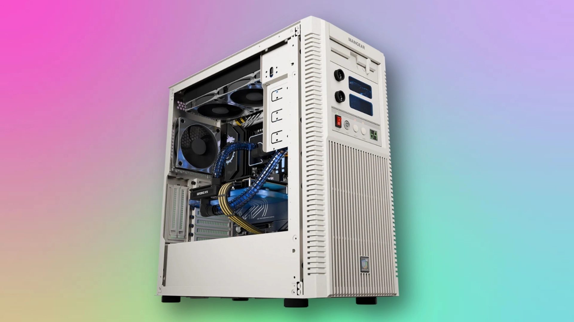 But if you want to go all-in on performance and style, the $9,799 Retro98a is equipped with an AMD Ryzen 9 9950X3D, an Nvidia RTX 5090, 64GB DDR5 RAM, and a 4TB SSD, and features a custom water loop to deliver maximum cooling. The coolant reservoir for the top-end pre-built is located in the 5.25-inch drive bays. At the same time, Maingear also used the classic “ketchup and mustard” color scheme for the braided power cables, reminiscent of old desktop builds from the late ‘90s and early aughts, while still avoiding the cable spaghetti you’ll usually find in them.