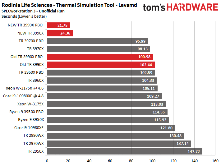 The updated benchmark isn't a panacea that can solve all issues in all benchmarks, as some of the underlying applications still aren't tuned for the unique Zen 2 architecture. However, these results underline our previous conclusions about the Threadripper 3990X, which we bestowed with an Editor's Choice award: