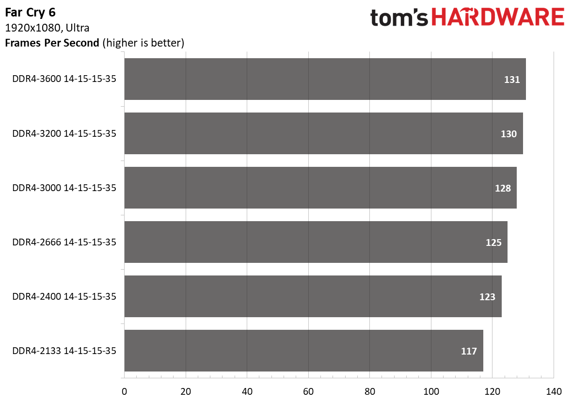 DDR4-3600 performed the best in gaming. The difference between DDR4-3600 and DDR4-2133 was 8%, whereas there was less than a 1% margin between DDR4-3600 and DDR4-3200. Not every game scales with memory frequency. Shadow of the Tomb Raider was the only title in our test suite to see an 18.3% margin between DDR4-2133 and DDR4-3600.