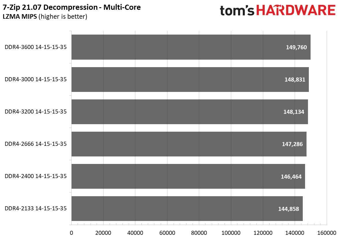 The DDR4-3600 configuration outpaced the DDR4-3200 by 2.5% in Photoshop and 5.5% in Lightroom. However, the performance delta was less than 1% in Premiere. Once again, faster memory shined in 7-Zip compression, where DDR4-3600 beat DDR4-3200 by a 13.4% margin.