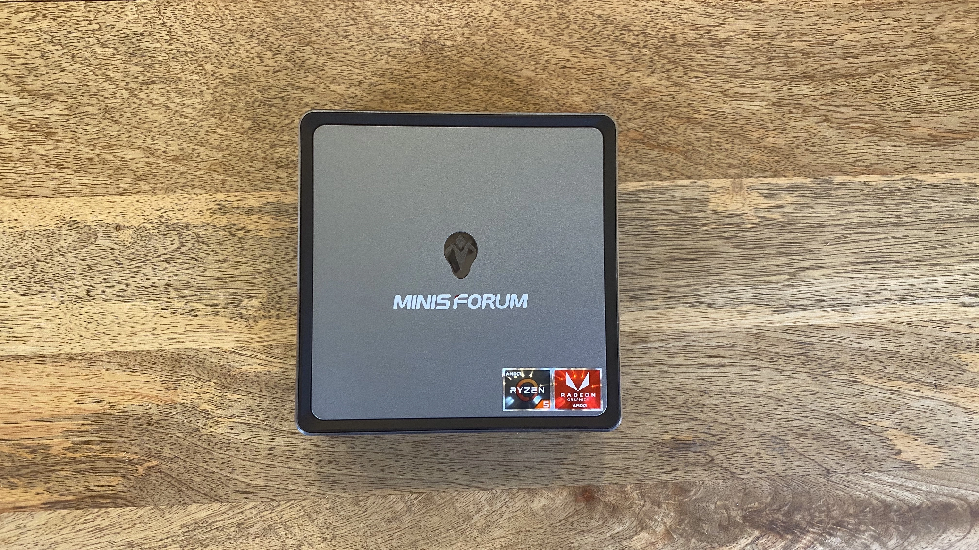 This mini PC is largely unobtrusive - exactly the design you typically want somewhere like an office or in your home theatre console. The top feels like plastic with the Minisforum logo on silver surrounded by a black border. Only one thing mars the professional feel of the Minisforum DMAF5: the Ryzen 5 and Radeon graphics stickers, which are small on a laptop but are comparatively huge on a 5.1 x 5 x 2-inch computer. The design is larger than Intel’s 10th Gen Core NUCs, which measure 4.6 x 4.4 x 2 inches.