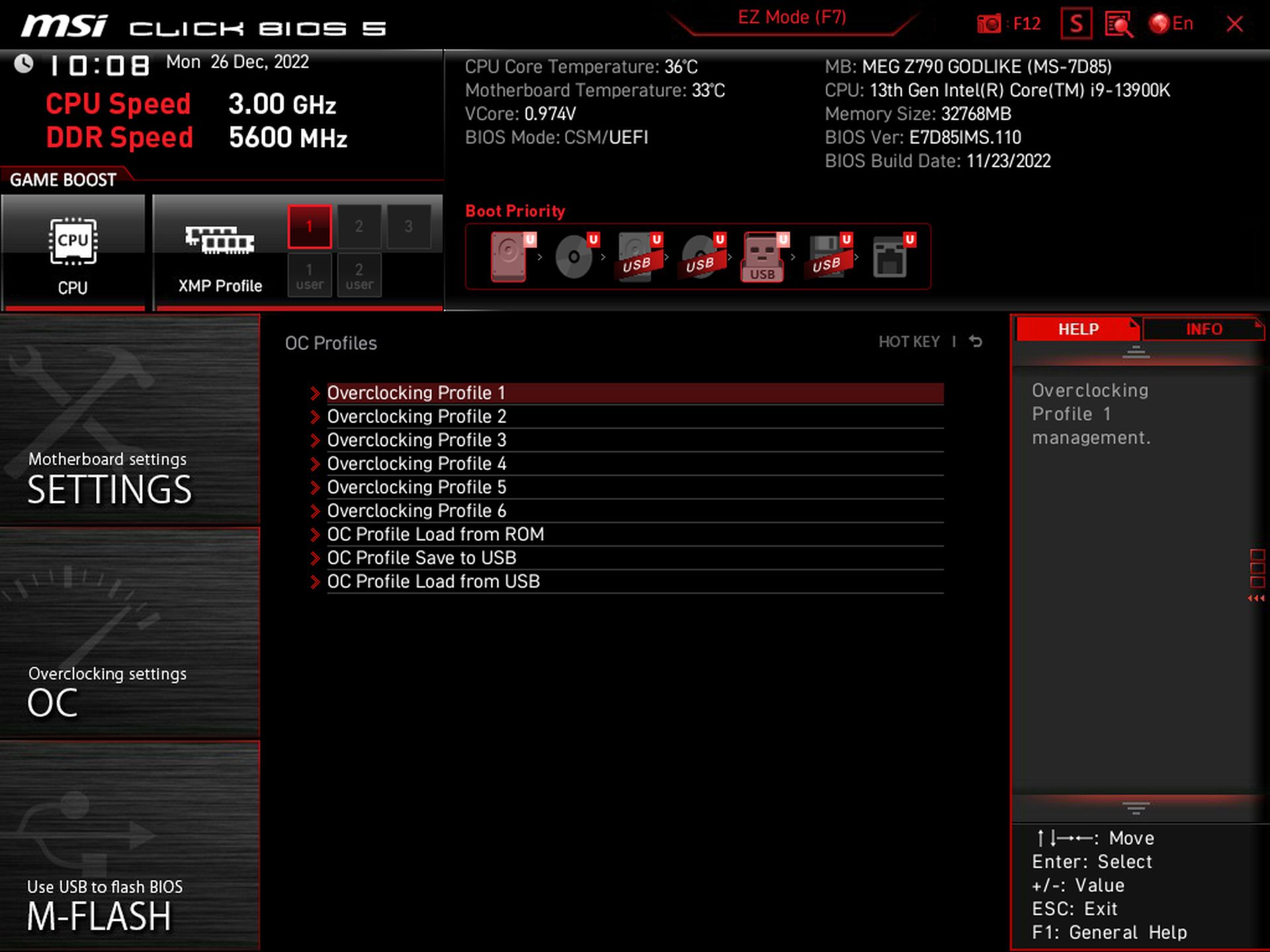 MSI’s BIOS for the Godlike is not much different than the Z790 Tomahawk we reviewed previously. The menus reside on the sides, and information up top, with a black and red background. It’s a unique look compared to the competition. For Z790, the only updates were functionality for the new processors and chipset. The color scheme is still easy to read, and there’s the usual informative Easy Mode that displays various information about the system and allows for some changes (boot order and XMP enabled). Though different than other UEFIs, it is easy to get around; everything has a place, and most frequently used options are readily available, not buried within sub-menus.
