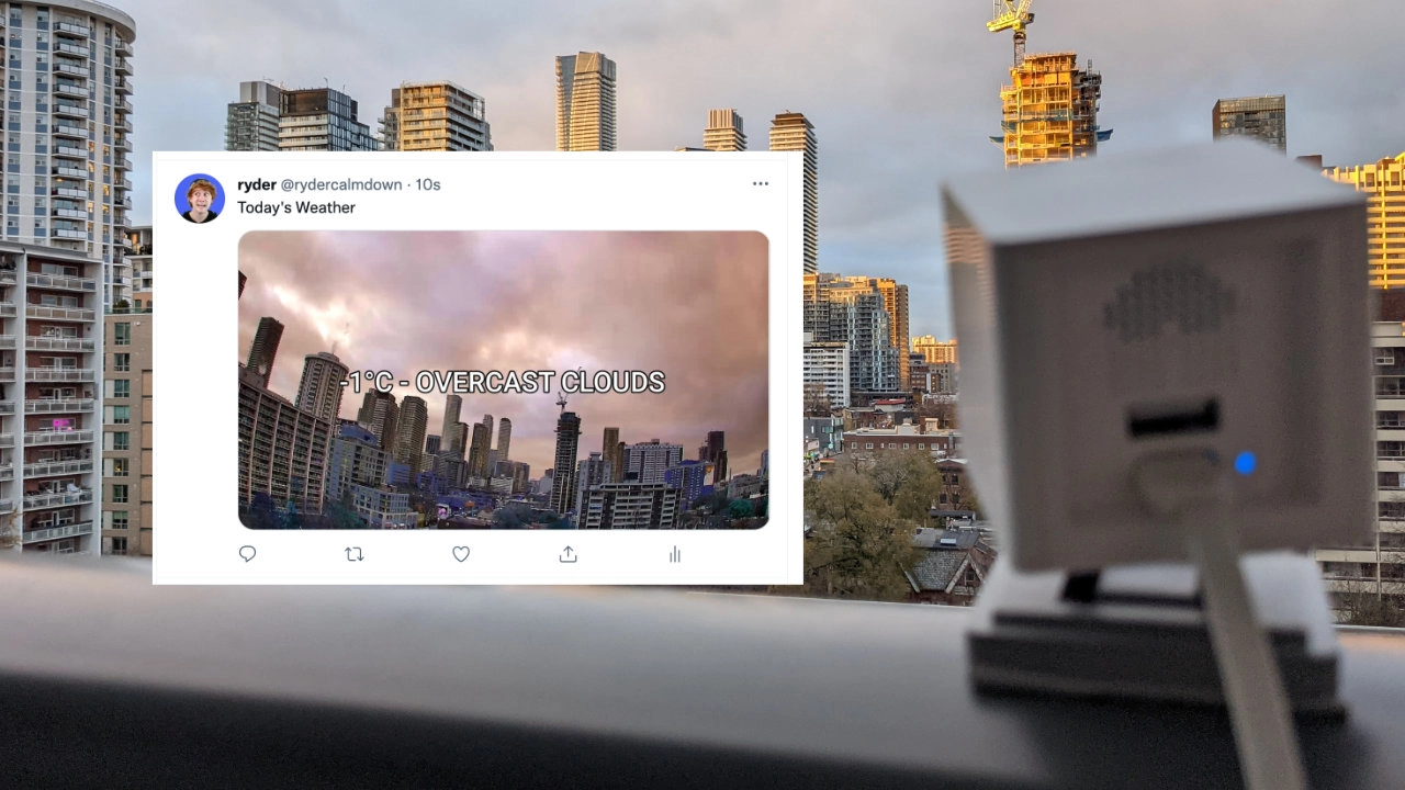 You now have a script that automatically takes a photo of the view, overlays the weather on top of it, and tweets the information out for the world to see. Use it at your leisure, or try automating it with crontab - good luck!