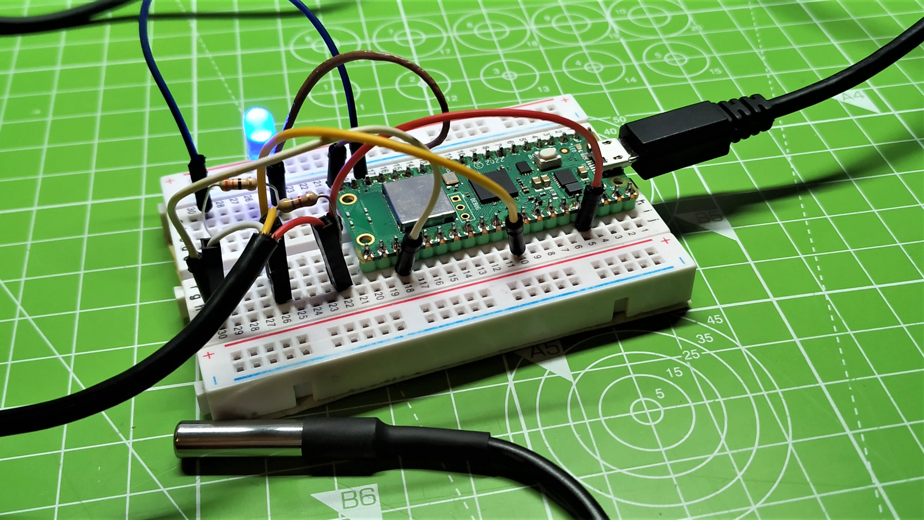 In this how-to, we will use a Raspberry Pi Pico to capture live temperature data using a DS18B20. This sensor comes in many forms, from a bare transistor chip, to a water resistant cable. We’ll be using the latter version, which can be partially submerged in a liquid to monitor the temperature. Our project will take a temperature reading and using a conditional test in MicroPython it will trigger an LED to flash if the temperature goes below 20 degrees Celsius.