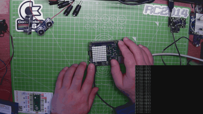 9. Set the LEDs in the RGB matrix using the values stored in the x, y, r, g, b variables. We set an individual pixel (x,y) to the color (r,g,b) before pausing for 0.1 seconds.
