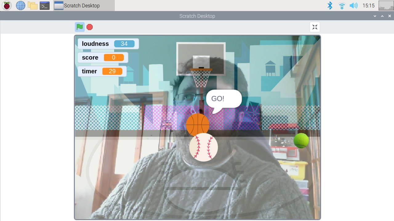 To start the game click on the Green Flag, place yourself in the view of the camera and then shout “GO!” to start the game. Good luck!