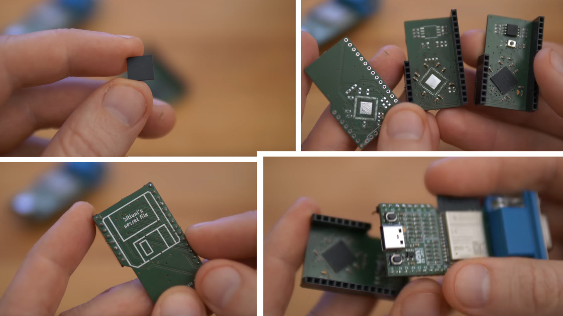 Elsewhere in the video, it is explained that everyone who was part of the TT2 program got the same chip and a manual with instructions to access any of the designs via the Caravel microcontroller wrapper for the user projects. Tiny Tapeout has a demo board with DIP switches making it easy to select and test any of the 165 projects. However, Bitluni wanted to make his project neater and therefore designed a dedicated PCB for the chip to make accessing his project a cinch.