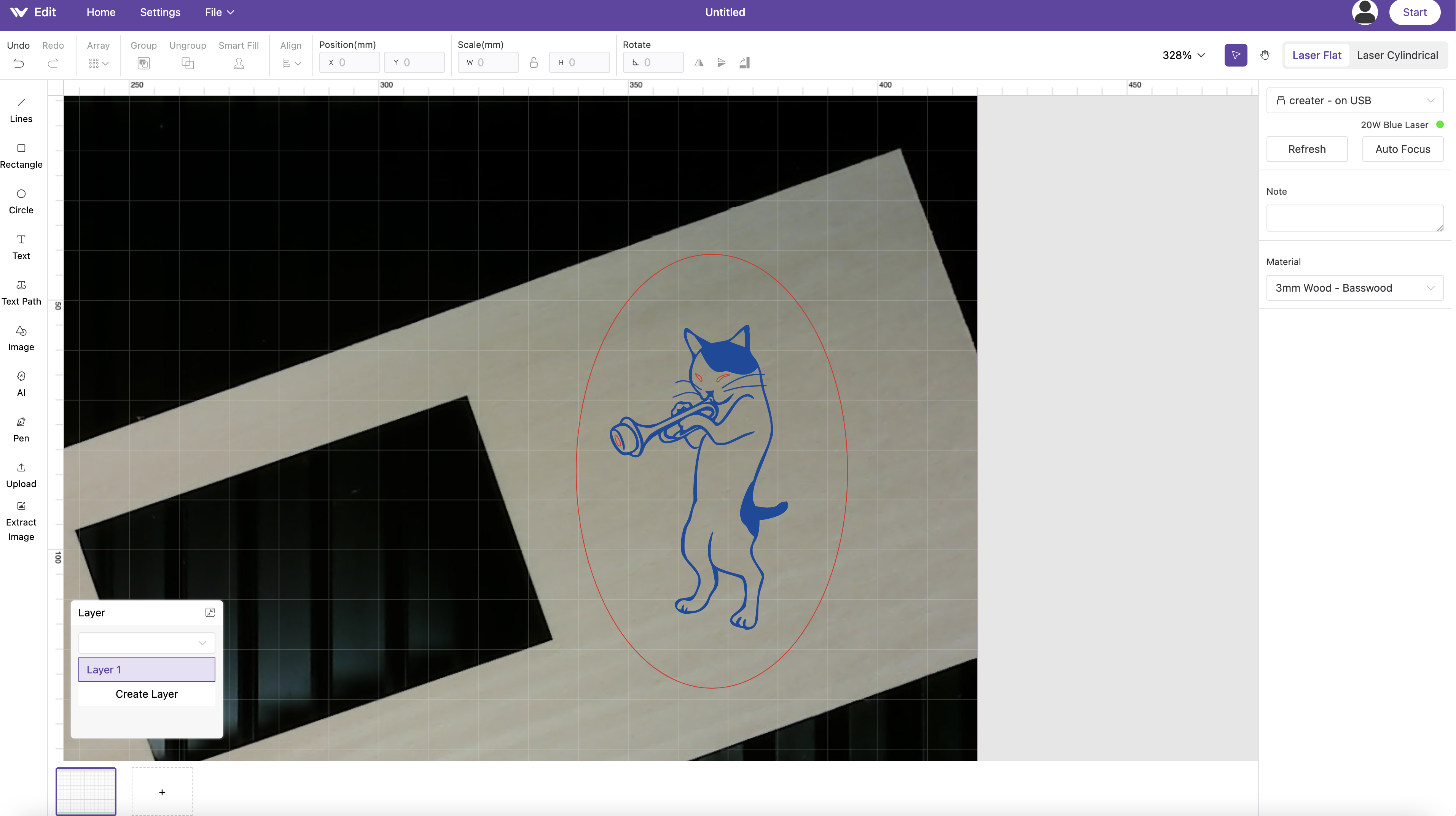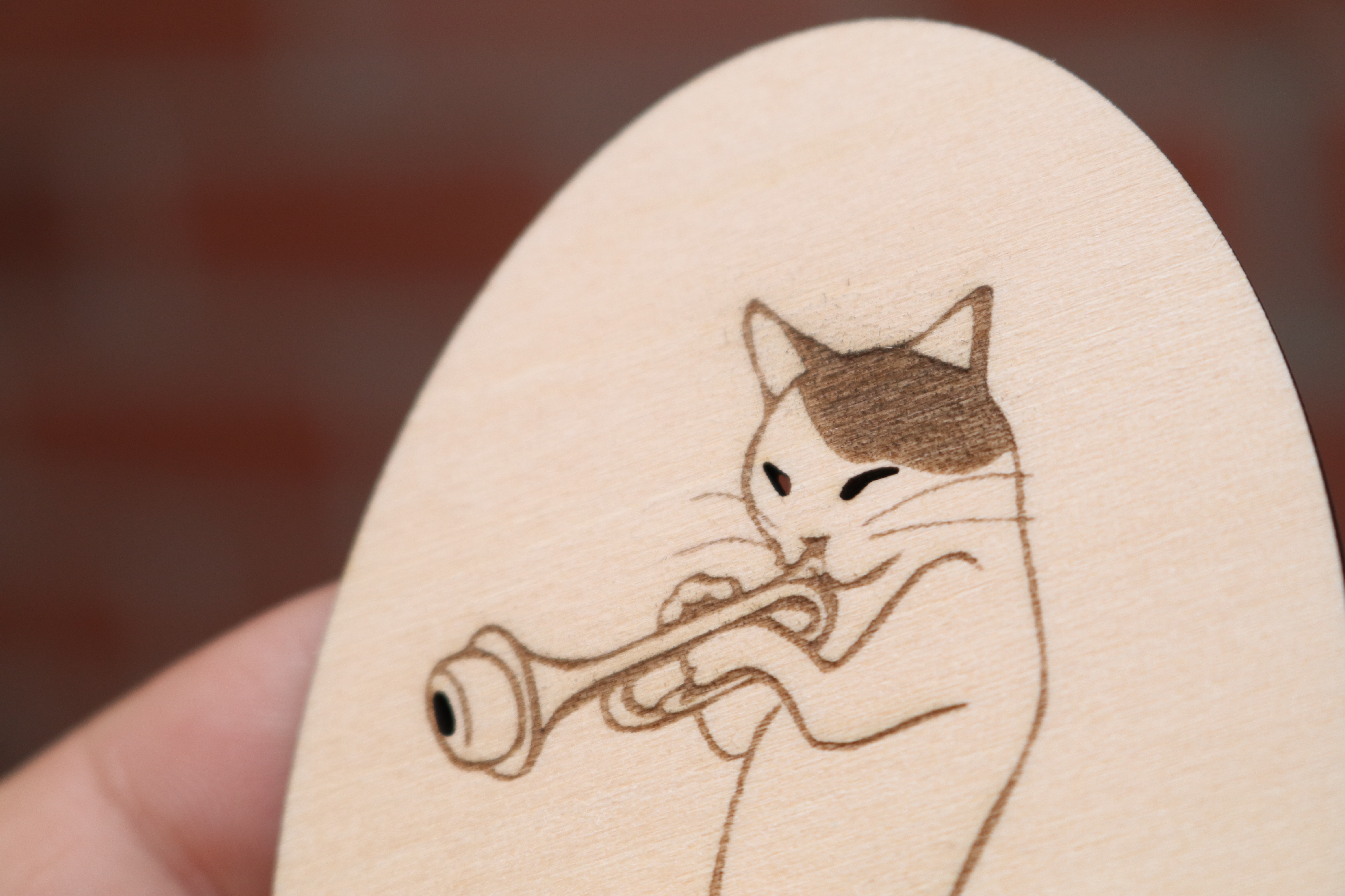 In the above example, a stock image of a cat playing a muted trumpet was selected from the library and processed in the software. The Engrave Fill mode was used to engrave the body while the Cut mode was used on the oval contour surrounding the image, the eyes, and on the trumpet mute.