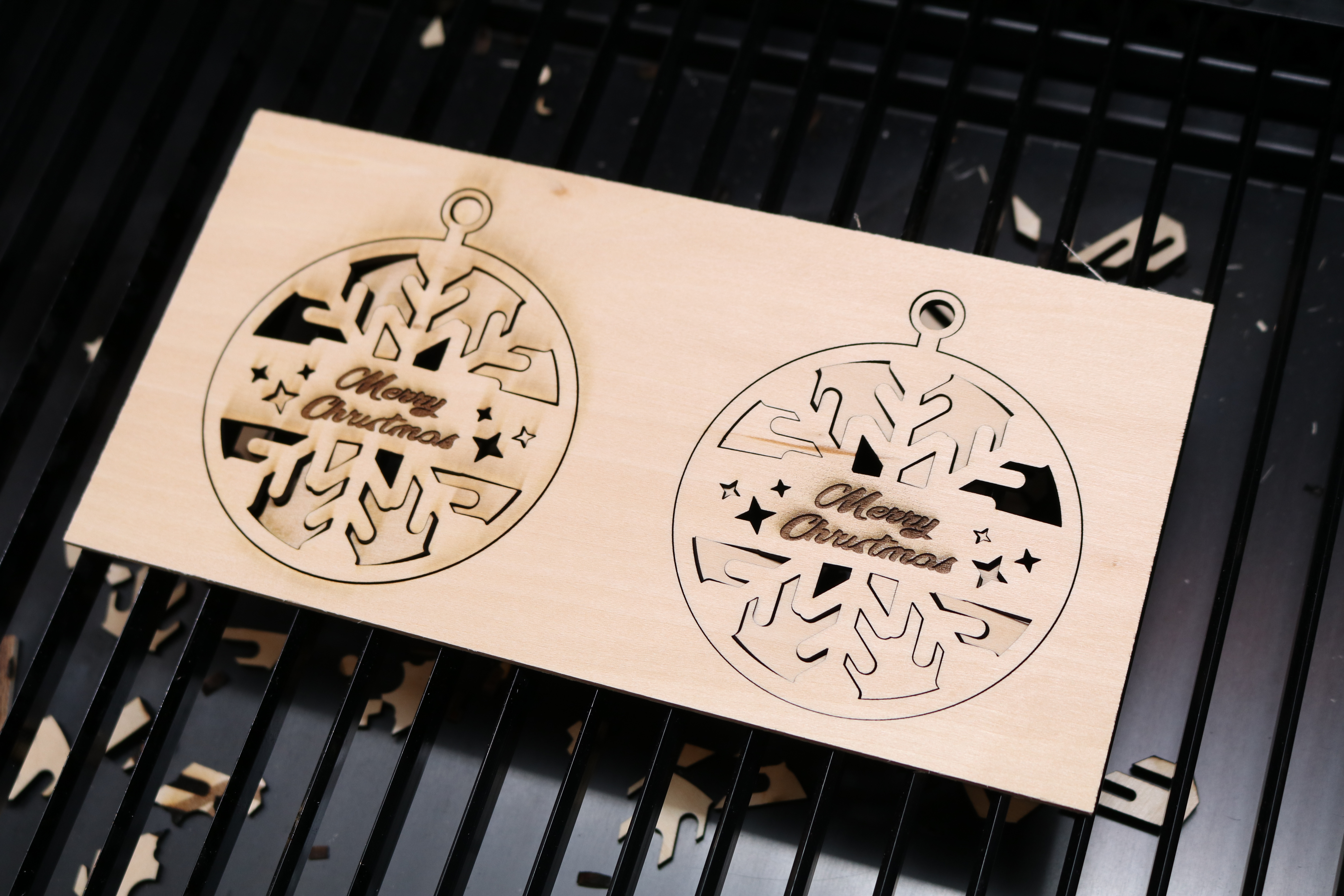 The included air assist module creates clean and sharp cuts without staining the wood during engraving. I ran the same Christmas ornament model from the MakeIt! library twice; once with the air assist enabled and once with it disabled. The ornament on the left (without the air assist) has deep discoloration around the cuts, and the engraving looks a little fuzzy in the corners. The ornament on the right (with the air assist) appears clear and sharp, showing how useful this feature can be.