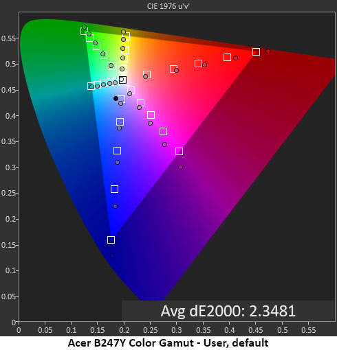 The B247Y is an sRGB monitor with a little bonus color in all parts of the gamut triangle. This maintains good balance since no color is more oversaturated than any other. The only error here is magenta, which is a tad bluer than it should be.