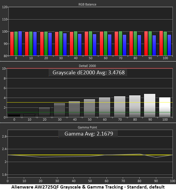 In the AW2725QF’s default Standard picture mode, you can see a slight blue reduction as brightness increases but the errors are only a hair past the visible threshold. One could use the monitor this way and be happy. Depth and contrast are solid thanks to accurate gamma which stays very close to the 2.2 reference line.