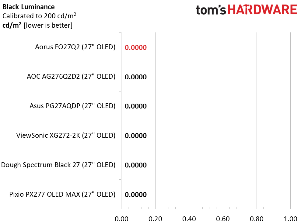 Calibration changes nothing in the contrast test, it’s still infinite. I preferred the FO27Q2 set to APL Stabilize High, so I used the second set of brightness values above to set my peak at 200 nits using a 25% window. Black levels are unchanged, so contrast remains unmeasurable for all the screens.