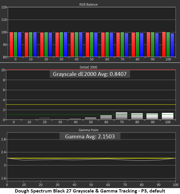 The Spectrum Black 27 has the best out-of-box grayscale tracking of the group with an impressive 0.84dE result. When the other screens are calibrated, it only slips one position. It doesn’t get much better than that. Even the sRGB mode’s score of 1.5dE would put it third before adjustment and fifth afterward.