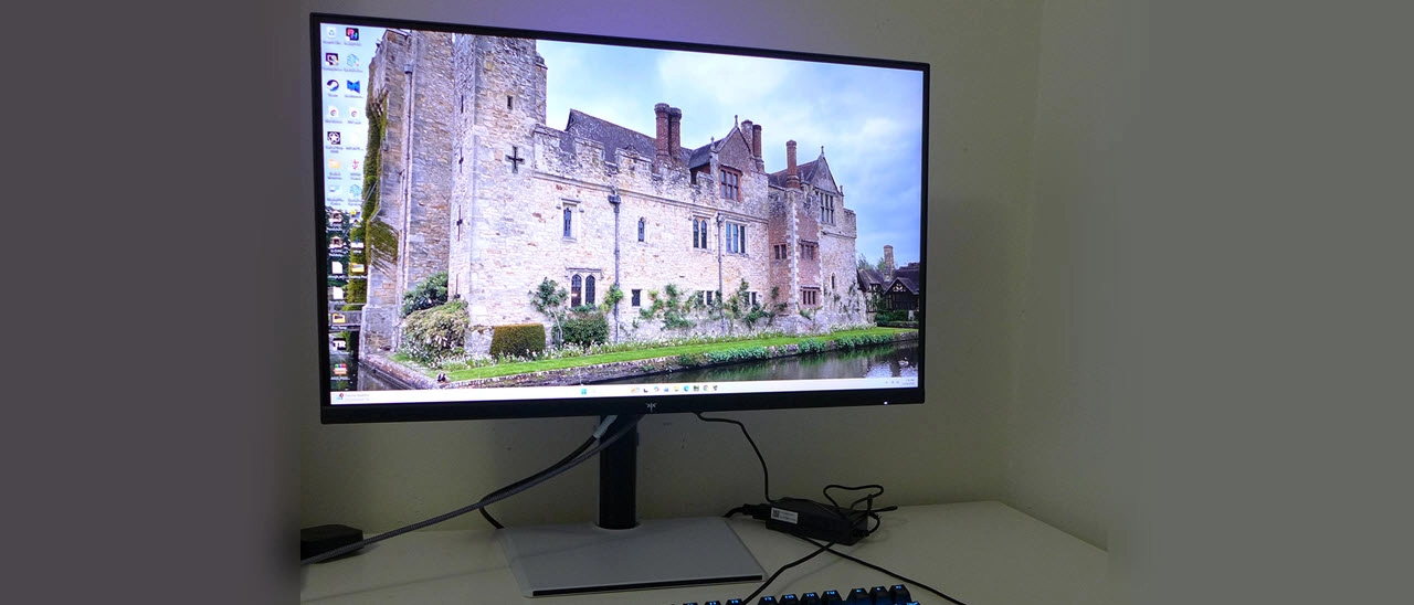 The H27E6 arrives packed securely in crumbly foam and assembles without tools. If you’d rather use your own arm or bracket, there’s a 100mm VESA mount in back, but you’ll need to source your own fasteners. A small external power supply is provided along with a DisplayPort cable.