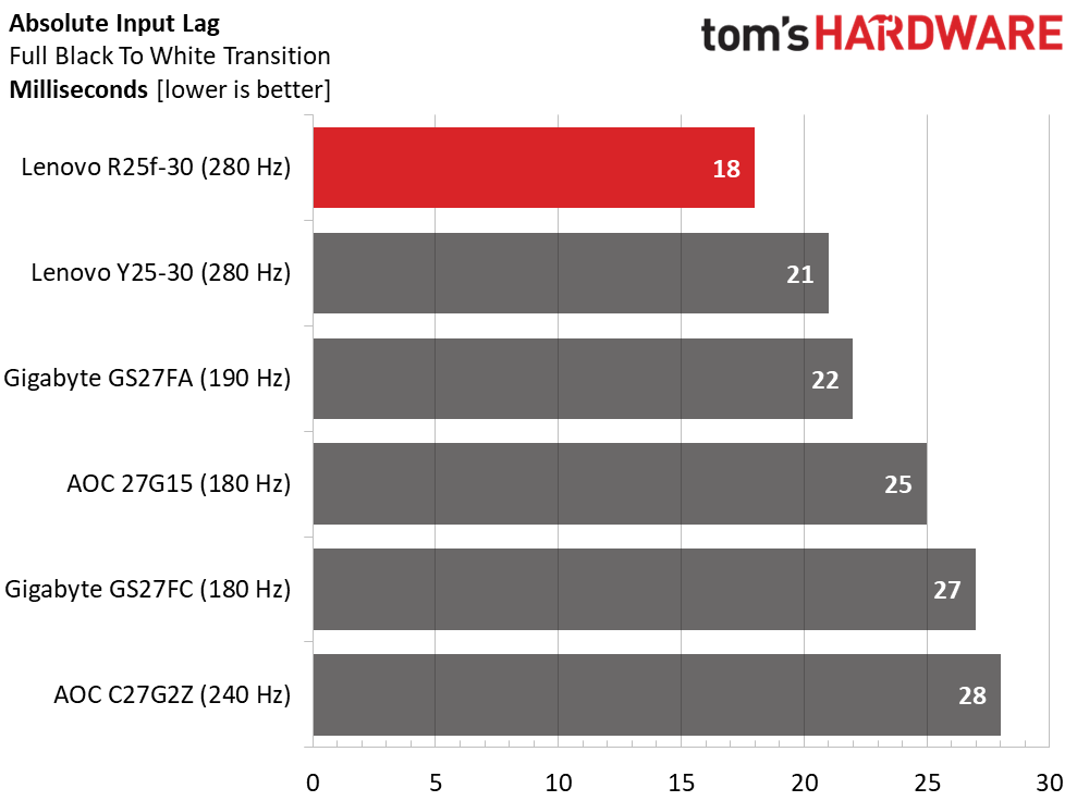 The two Lenovos dominate these tests with their 280 Hz refresh rates. On a dollar/speed basis, they are the best values available. You just need to pick your preferred screen tech, VA or IPS. In the lag test, the R25f-30 wins the day with a very quick 18ms total score. That’s on par with many costlier monitors that run at higher refresh rates. The R25f-30 is further enhanced by its precise overdrive that removes nearly all traces of motion blur.
