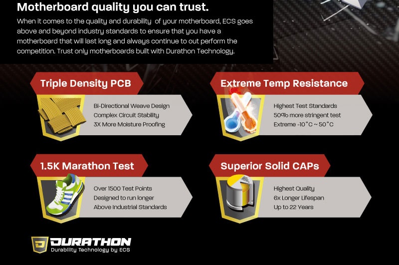Some of the techniques that ECS will use to create its Durathon motherboards include Triple Density PCB building, the use of extreme temperature resistant components, superior solid capacitors and a 1.5K Marathon Test.
