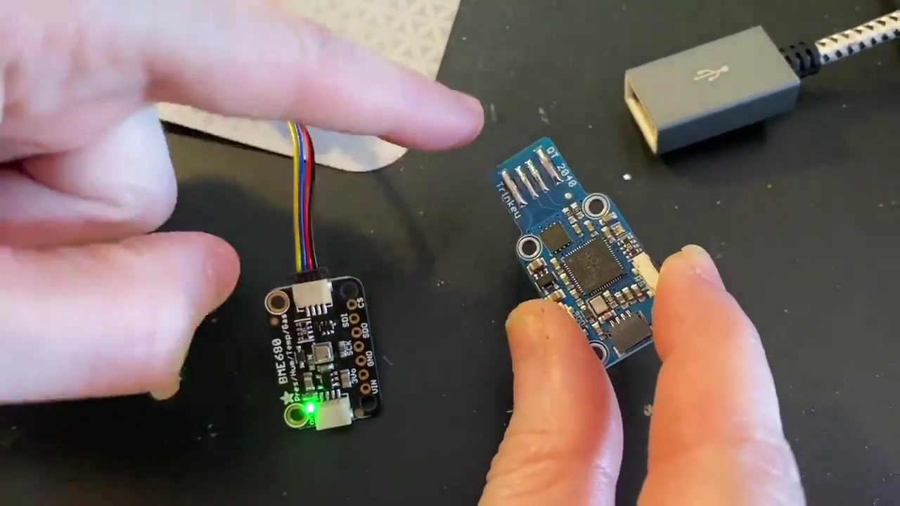 The QT 2040 Trinkey has the same basic layout as a Stemma QT components, such as the BME680 used in the video, can be mounted on top of the QT 2040 Trinkey for a neat form factor.