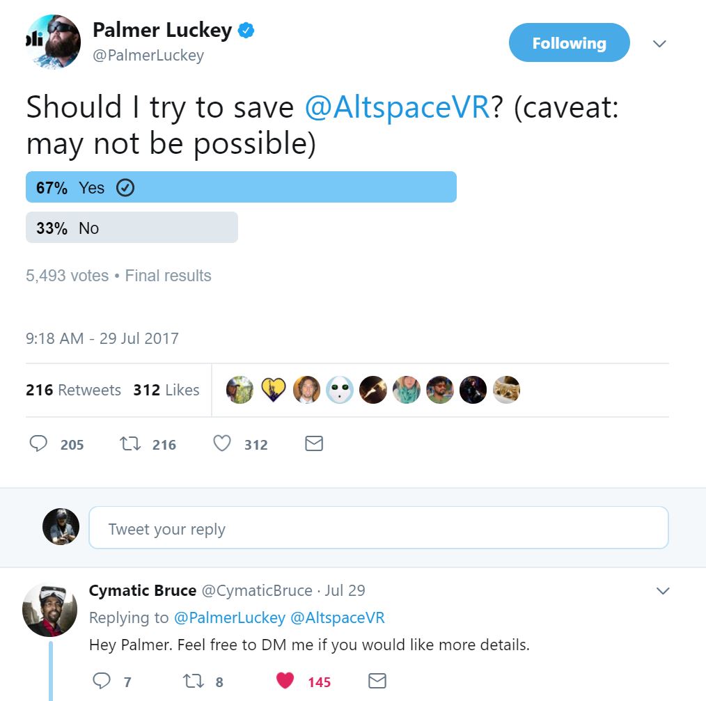 We don’t know exactly what or who saved AltspaceVR, but it’s entirely possible that Palmer Luckey had something to do with it. On July 29, Palmer Luckey started a poll on Twitter asking if he should try to save AltspaceVR. Luckey’s query received 5,493 votes, with 87% of the tally saying yes, he should save the platform. Cymatic Bruce, one of the public faces at AltspaceVR, quickly replied to Luckey’s tweet saying that Luckey could send him a private message for more details. That doesn’t guarantee that Luckey had anything to do with saving AltspaceVR, but the fact that he beat the official AltspaceVR Twitter account to the announcement by 12 minutes suggests that he’s on the inside of this deal.
