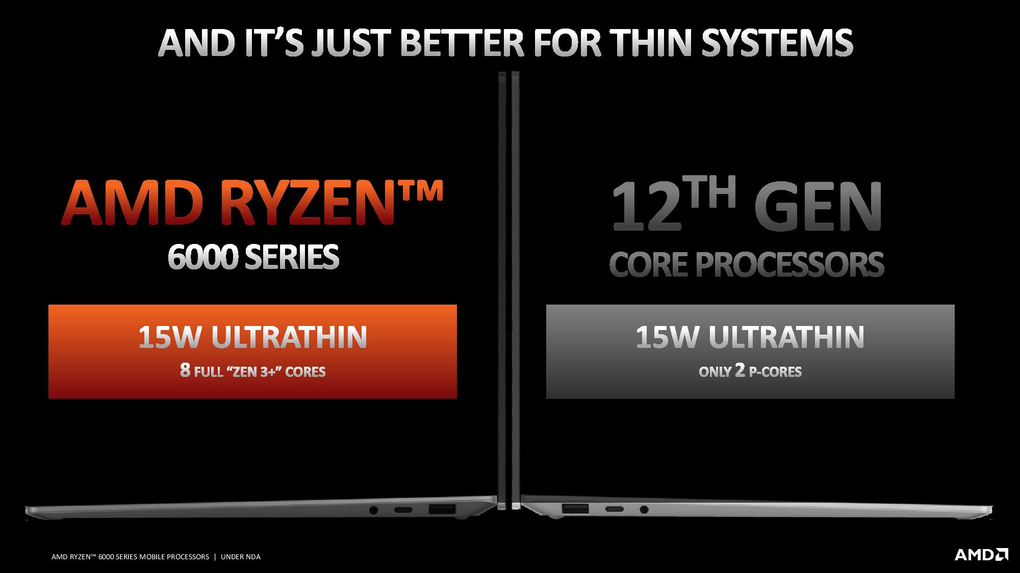 AMD also believes that Intel will have scalability issues as it moves down from the 110W "max effort" notebooks we saw in early reviews into 35W, 28W, and 15W notebooks that serve the vast majority of the market. So naturally, AMD believes this will result in performance and battery life advantages for Ryzen 6000. In fact, AMD even claims that Intel has to use efficiency cores because it can't cram eight performance cores into 28W and 15W ultrathin notebooks, while Ryzen 6000 offers eight full-performance cores across its full product stack. AMD claims that Intel continues to face issues because it hasn't actually fixed its process node issues.