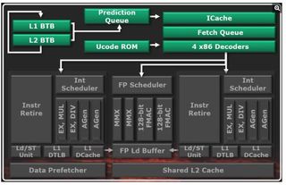 Here we can see the crux of the debate about AMD's Bulldozer marketing. Each module's front end resources, in gray at the top of the first graphic, are shared between two integer cores (marked in green). The floating point unit (FPU) resides between the two integer cores but provides the only floating point processing for the entire module. The L2 cache is also shared between all three functional units. Combined with the shared prediction queue and instruction/fetch caches, the integer cores cannot operate independently of one another.