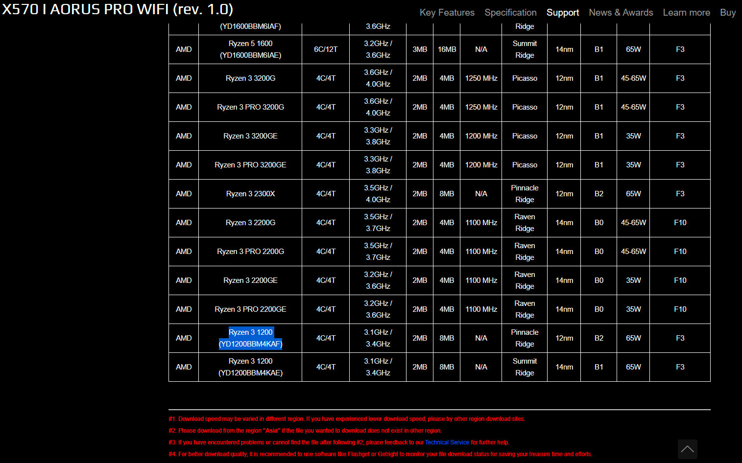Gigabyte's CPU support list (pictured below) shows that the Ryzen 3 1200 has the B1 stepping, and the Ryzen 3 1200 AF is on the B2 stepping. The AF variant doesn't require a firmware update to play nice with existing AM4-based motherboards either.