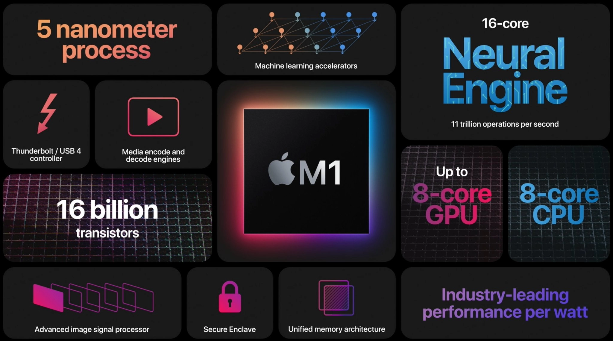 It's a 5nm chip with 16 billion transistors. It has 8 cores, four for power and four for efficiency. Srouji said the high-performance cores are the world's fastest and deliver the best performance per watt. It has a 10W thermal envelope.
