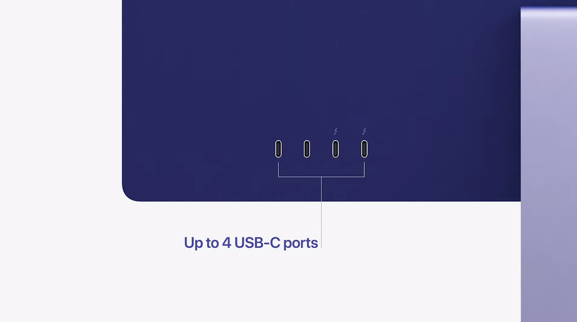 The M1 iMac has 4 USB-C ports, including 2 Thunderbolt ports, with support for a 6K display. There's a new magnetic power connector, with a woven cable, that connects to the power adapter. If you want wired connectivity, Ethernet connects to the power adapter and is routed to the system.