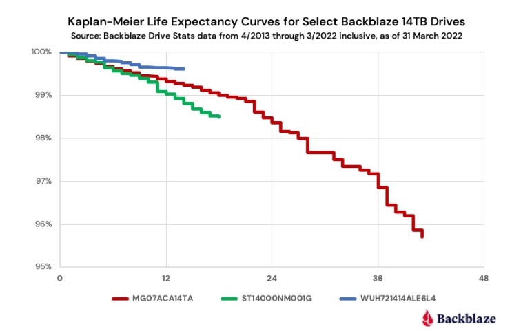 Backblaze took its analysis as far back as April 2013, and analyzed all hard drives they've commissioned into work in a high enough number that allowed them to apply the Kaplan-Meier life expectancy curve. This curve, which has its roots in biological science, takes into account the number of subjects that have survived a treatment among all those that received it. There's no issue in applying it to other fields - as it often is. In the case of Backblaze's analysis, the "treatment" is the moment these hard drives start running. Unsurprisingly, some of them did die before the deadline for the gathered data, March 31st 2022.