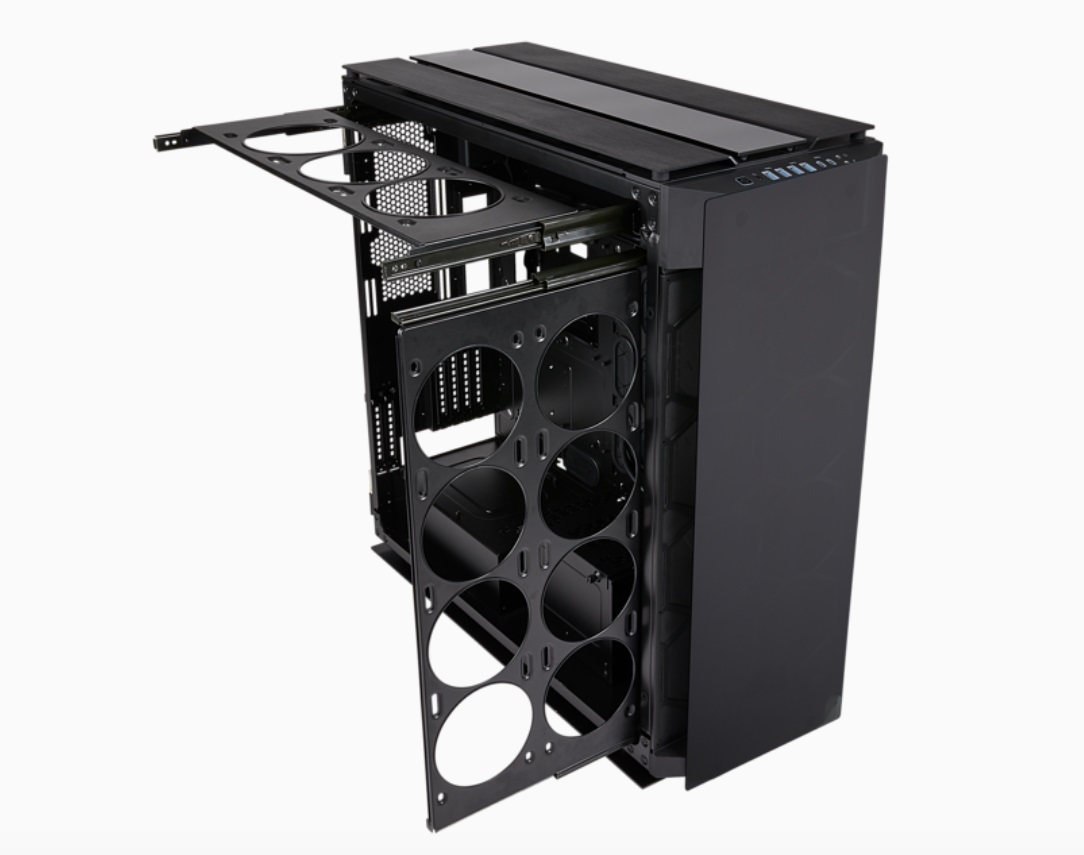 The chassis doesn’t come with any fans installed, but it has space for up to thirteen 120/140mm fans (eight front, three top, two rear). The front panel alone can support up to two 480mm radiators, the top panel supports up to one 360mm radiator, and the back panel can sport up to a 280mm cooler. Both the top and front radiator trays (fans mounts) are surprisingly accessible; they're attached to rails and glide out of the case for easy installation.